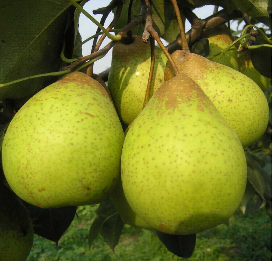 生物学特性:晚熟鲜食品种。果实近短瓢形,果实大,平均单果重295g;果皮绿黄色,贮后变黄色,果面平滑,有蜡质光泽,果点中多、中大。果肉白色,肉质细,石细胞少,酥脆多汁,风味酸甜适中,具芳香,品质优良。果心小。可溶性固形物含量11.5%~12.5%。抗寒性中等,抗黑星病能力强,兼抗果实木栓化斑点病。