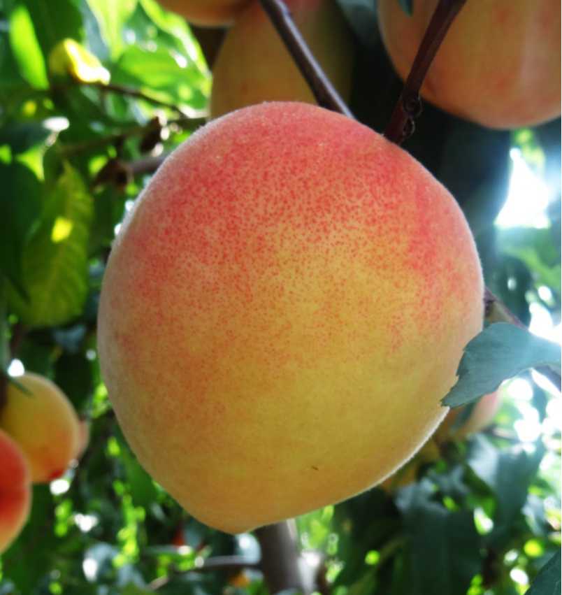 生物学特性:中晚熟品种。树势中庸,树姿极开张。花朵蔷薇形,花瓣5个、浅粉色,自花结实。离核,果皮底色黄白色、果肉黄白色,平均单果重170.5克,果实平均可溶性固形物8.7%,可滴定酸含量0.90%,维生素C含量5.28毫克/100克。果实出汁率70.1%,果汁玫瑰红色,不易褐变,表现出良好的制汁加工性状。丰产性、抗逆性和商品性表现良好。