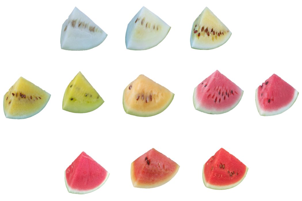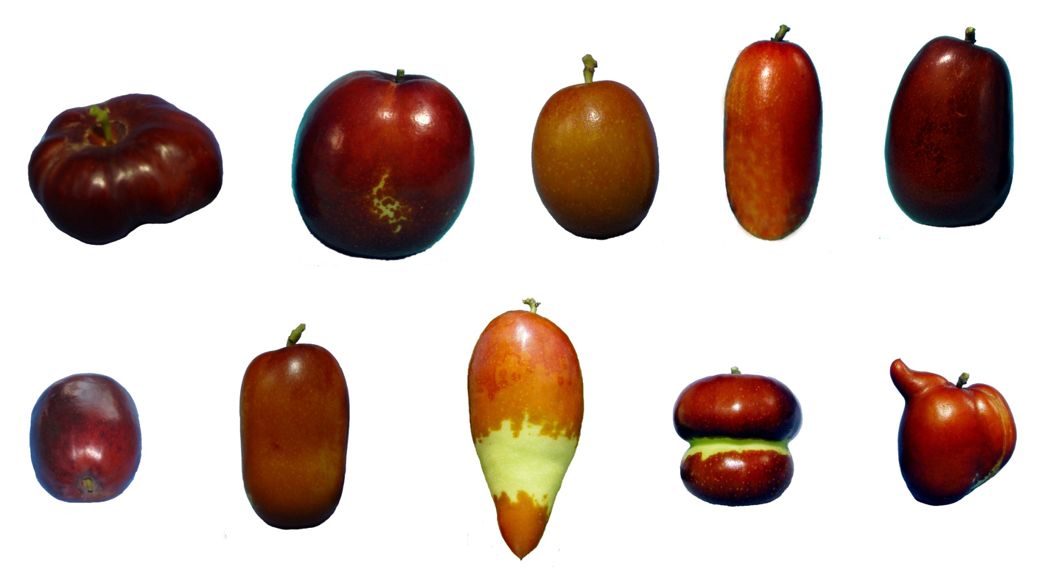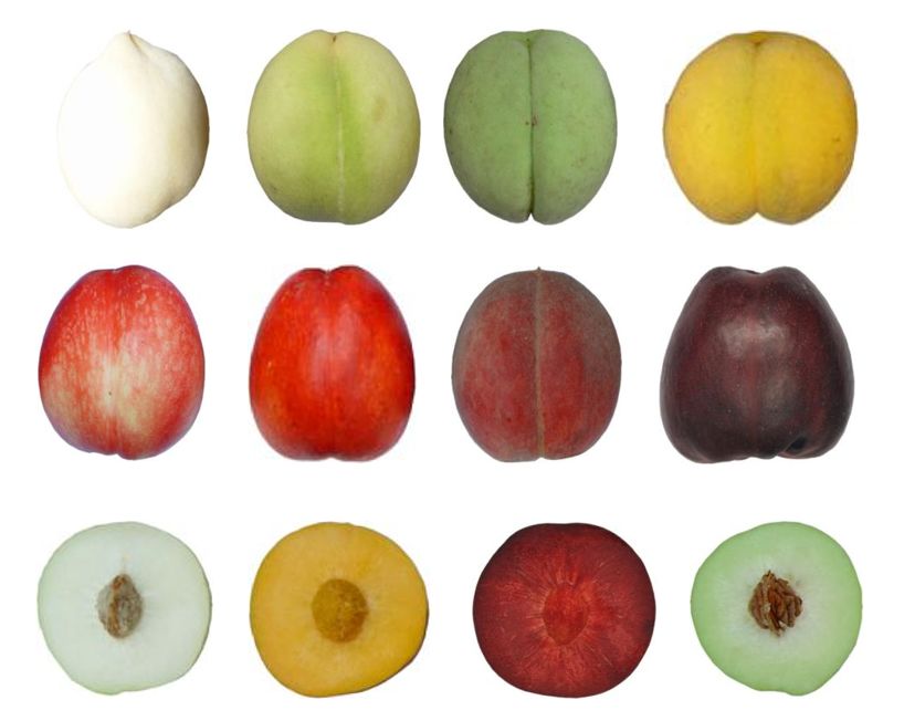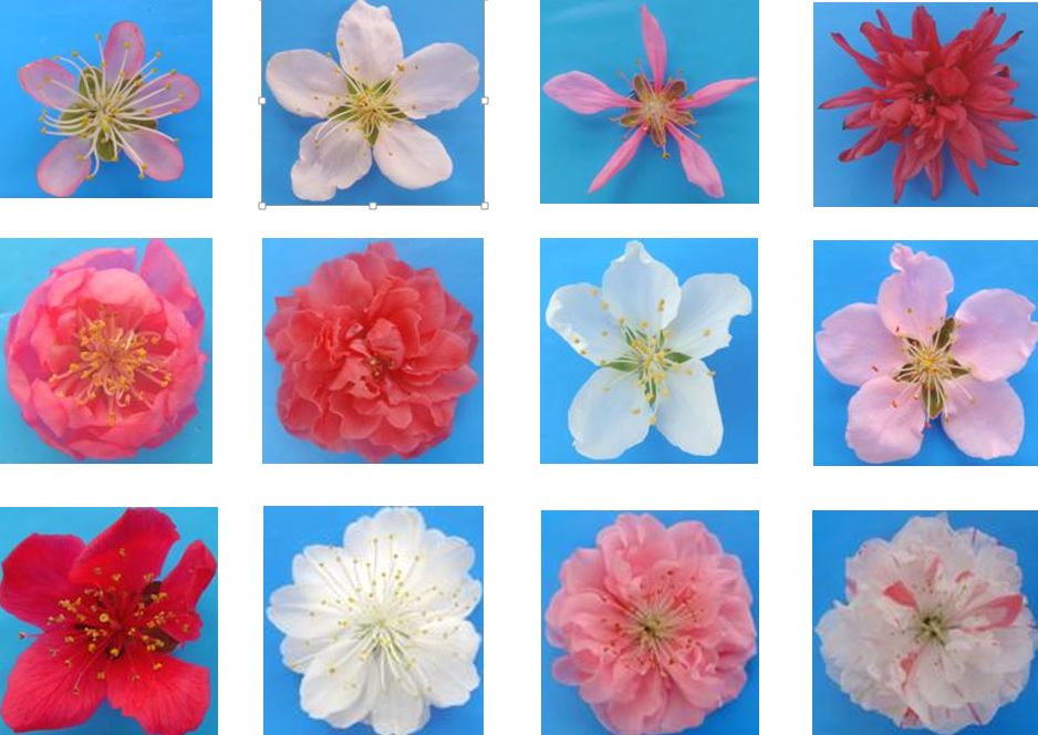 桃有光核桃、甘肃桃、陕甘山桃、山桃、新疆桃等24个种,果实类型有普通桃、油桃、蟠桃和油蟠桃,果形有扁平、扁圆、圆、椭圆、卵圆和尖圆,果皮底色有乳白、绿白、绿、乳黄、黄和橙黄,果肉颜色有白、绿、黄和红,花型有铃型、蔷薇型和菊花型,花瓣类型有单瓣和重瓣,花瓣颜色有白、粉红、红和杂色,叶色有绿、绿黄和红等。