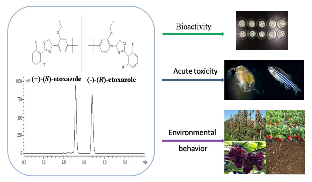 该研究首次系统解析了乙螨唑不同对映体[(+)-S(-)-R]在水果(苹果、草莓、葡萄)和田间土壤中的立体选择性环境行为、对靶标生物(朱砂叶螨、二斑叶螨)的生物活性和对非靶标生物(斑马鱼、大型溞)的急性毒性。研究结果表明,乙螨唑不同对映体的生物活性和急性毒性均存在显著的立体选择性,其在田间土壤和水果中存在显著的立体选择性环境行为。研究结果对于乙螨唑的安全使用和风险评估等具有极其重要的理论意义和实践应用价值,并可为该类农药的安全应用和有效管理提供科学参考。