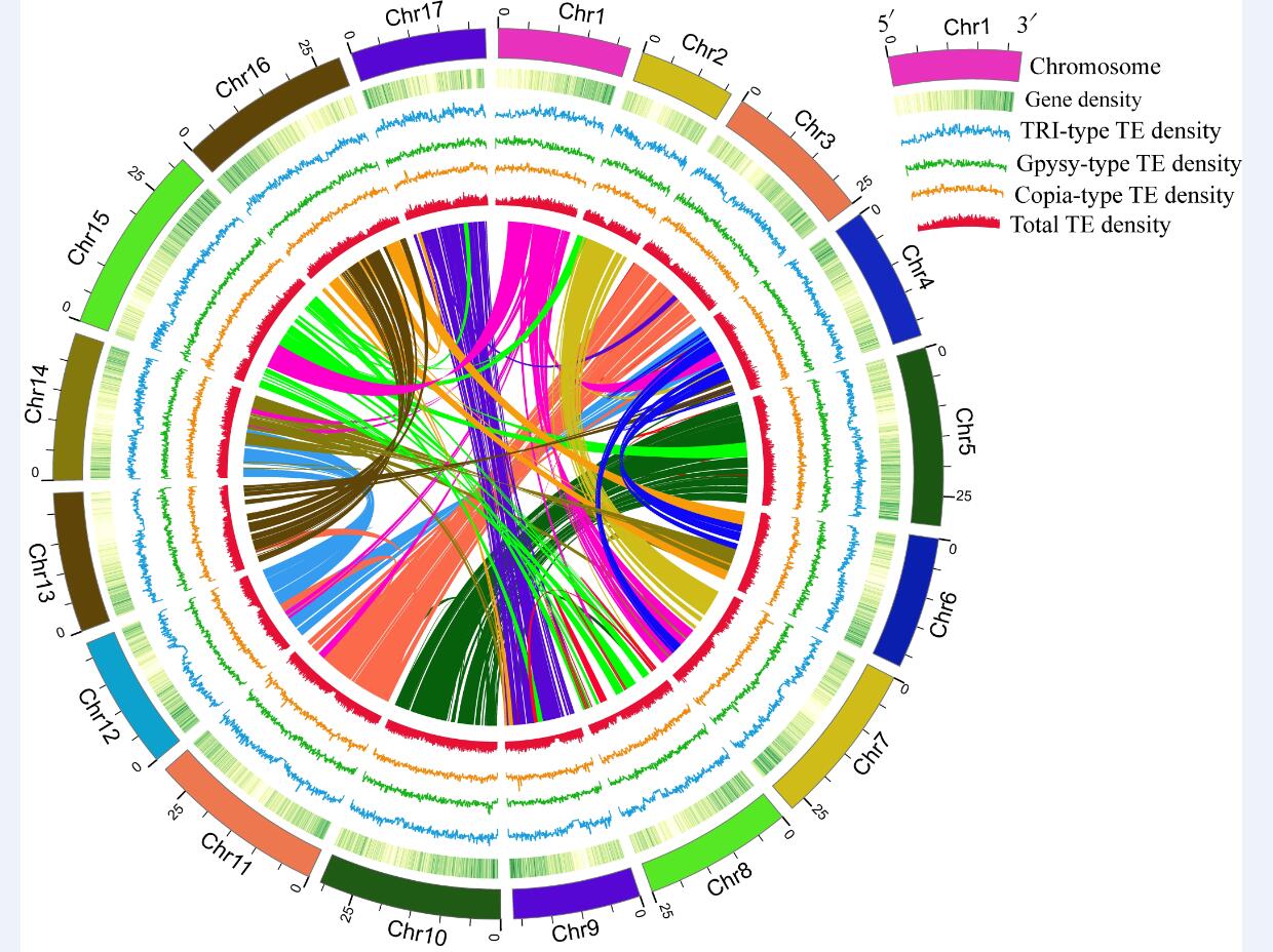 该研究以‘中矮1号’为试材,以PacBio三代测序技术为主,Illumina二代测序技术为辅进行了全基因组测序和组装,并通过Hi-C技术将组装的contig挂载到染色体水平。该研究最终获得了一个510.59 Mb的参考基因组,contigN50为1.28 Mb,其中,506.31 Mb99.16%)的序列被挂载到17条染色体上,已知顺序和方向的序列为427.18 Mb,占预测基因组大小的(511.33 Mb)83.5%。该基因组还成功预测了309.86 Mb (60.68%) 的重复序列和43,120个蛋白编码基因,是继该团队杜梨基因组后的另一个高质量梨参考基因组。