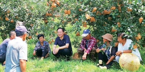 图为程存刚(右四)向果农讲解苹果园“生草养地”技术。