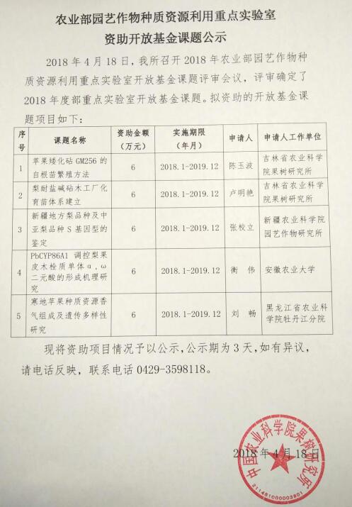 农业部园艺作物种质资源利用重点实验室资助开放基金课题公示