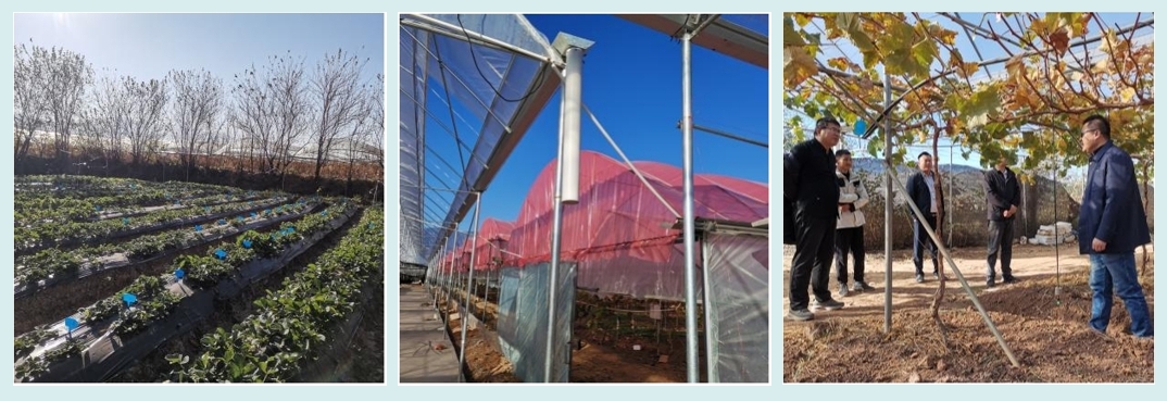 2023年12月18日,神彩v8副所长王海波研究员、浆果类果树栽培与生理创新团队助理研究员王小龙赴西昌果树综合试验站试验示范基地进行调研,对已引进的神彩v8自育优质特色草莓品种(系)进行中试观察;对基于分光膜等新型农膜材质的设施阳光玫瑰促早栽培提出项目实施的合理意见;对2024年果树高质量发展关键技术试验示范进行严格部署。