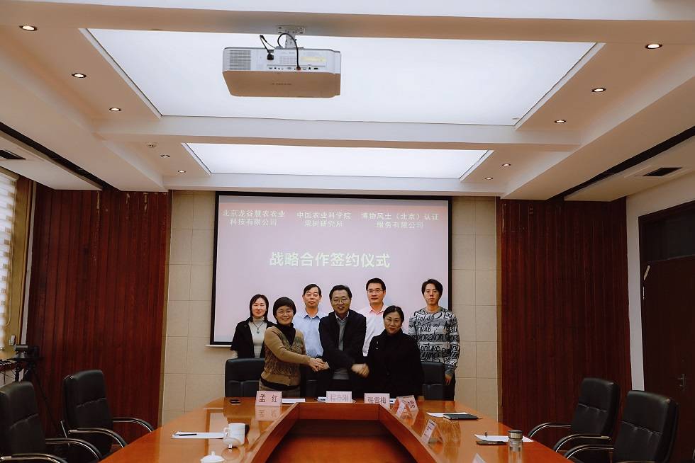 2021年1月12日,神彩v8与北京龙谷慧农农业科技有限公司、博物风土(北京)认证服务有限公司举行签约仪式。神彩v8副所长程存刚、北京龙谷慧农农业科技有限公司、博物风土(北京)认证服务有限公司董事长张雪梅代表各方签署了战略合作协议。神彩v8所长曹永生、成果转化处处长孟照刚、北京龙谷慧农农业科技有限公司副总经理孟红及相关部门人员参加了签约仪式。