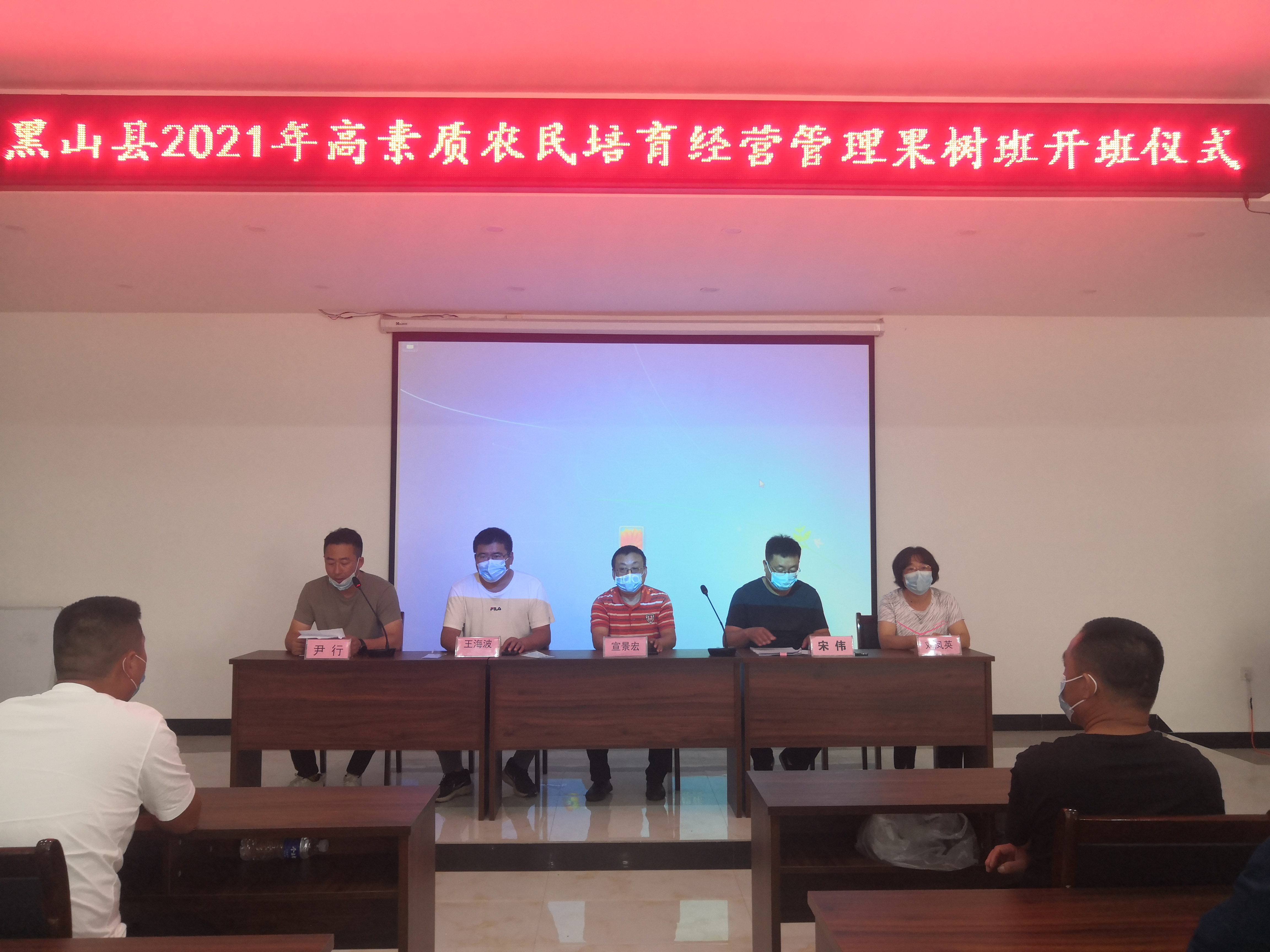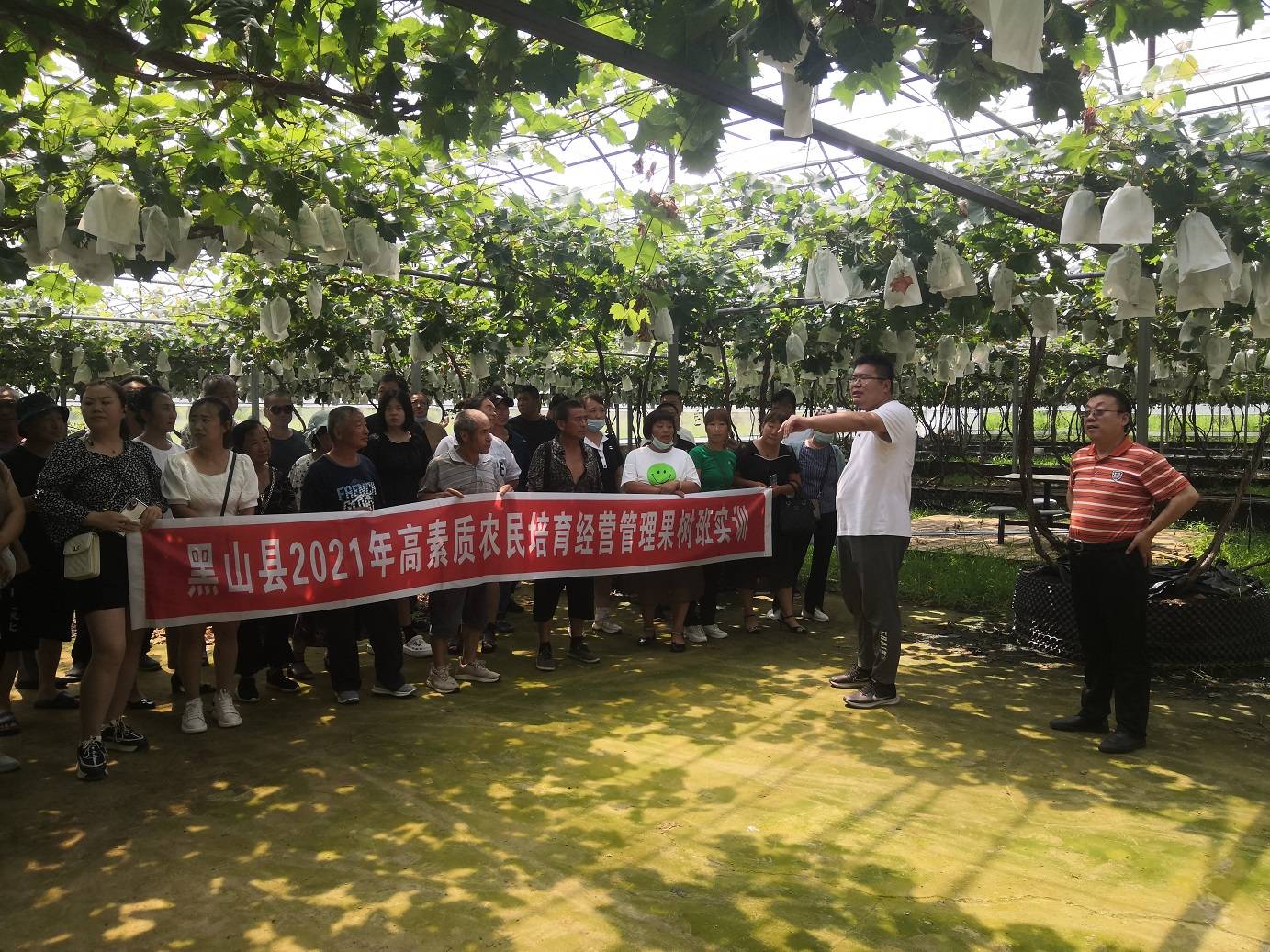 王海波一行在黑山县农业农村事务服务中心副主任宋伟、锦州市一粒萄技术服务有限公司总经理王静的陪同下,首先考察了当地葡萄的种植情况及所面临的问题并制定了相应的解决方案,随后参加了黑山县2021年高素质农民培育经营管理果树班的开班仪式,并对学员就葡萄标准化生产技术和营养与施肥技术等方面进行了全面系统的培训。