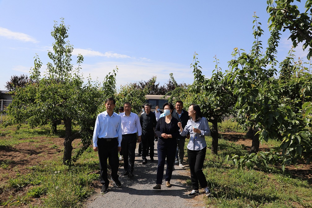 金玉枝一行在曹永生等人陪同下,深入神彩v8梨育种试验示范园、盆栽果树和设施果树栽培示范园实地调研,认真听取有关领域专家关于如何选育好吃、好看、好种、好卖、好想水果的技术创新成果介绍。