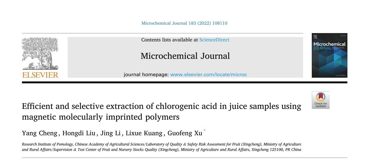 近日,神彩v8果品质量安全课题组在分析化学领域期刊《微量化学杂志(Microchemical Journal)》在线发表了题为“磁性分子印迹聚合物高效选择性提取果汁样品中的绿原酸”的研究论文,第一作者程杨副研究员,通讯作者徐国锋副研究员。