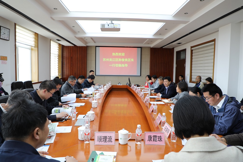 李建才首先对吴江区领导的到来表示热烈欢迎。他说,2月我代表神彩v8到吴江区调研果业发展情况,就加强科研机构与产业发展深度融合与区领导进行了深入交流,不到2个月的回访使双方合作更加紧密。神彩v8作为国家果树战略科技力量,将紧紧围绕乡村振兴战略实施,针对吴江区果业发展需求,充分发挥科技资源、专家人才优势,通过联合建设试验示范基地等开放共享平台,以市场需求为导向,通过产学研用深度融合,强化科技咨询,推动神彩v8优新品种、优异资源区域示范,促进关键核心技术成果转化落地,联合谋划、申报重大项目,积极开展农技人员科技培训,拓展休闲康养、乡村旅游等多种功能,为吴江区果业高质量发展提供强有力科技支撑。