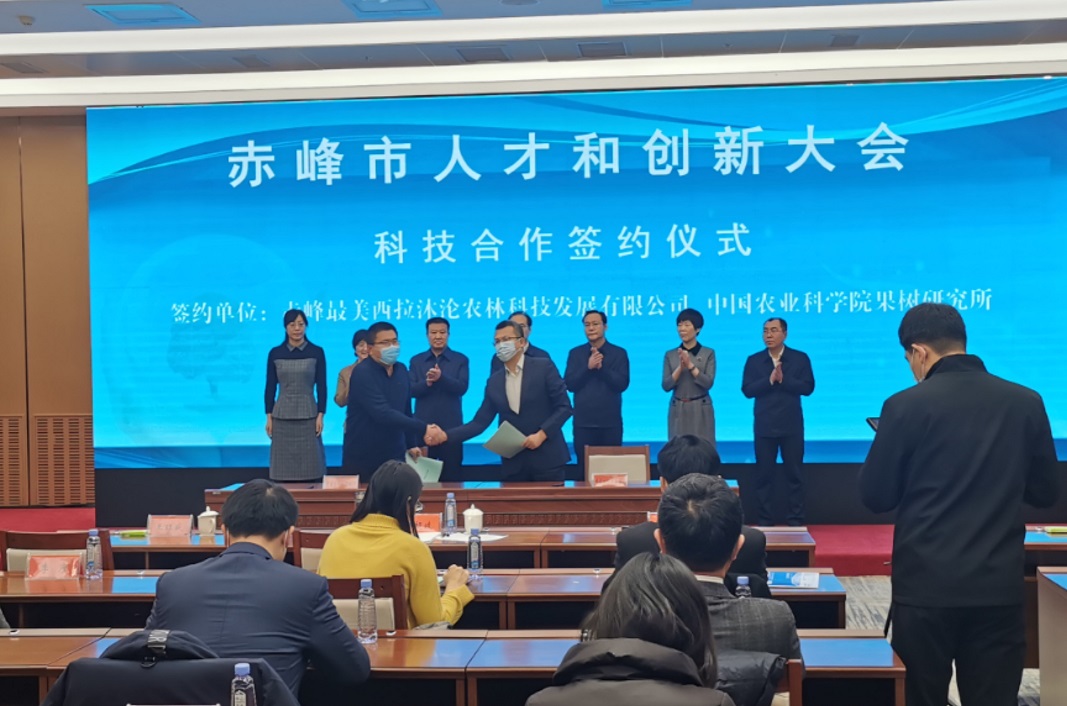 12月24-25日,神彩v8副所长王海波一行3人到赤峰市开展合作交流,在赤峰市人才和创新大会上,王海波代表神彩v8与内蒙古创城文旅集团董事长高玉鹏签署“落叶果树无病毒苗木组培脱毒扩繁栽培一体化技术服务”合作协议。