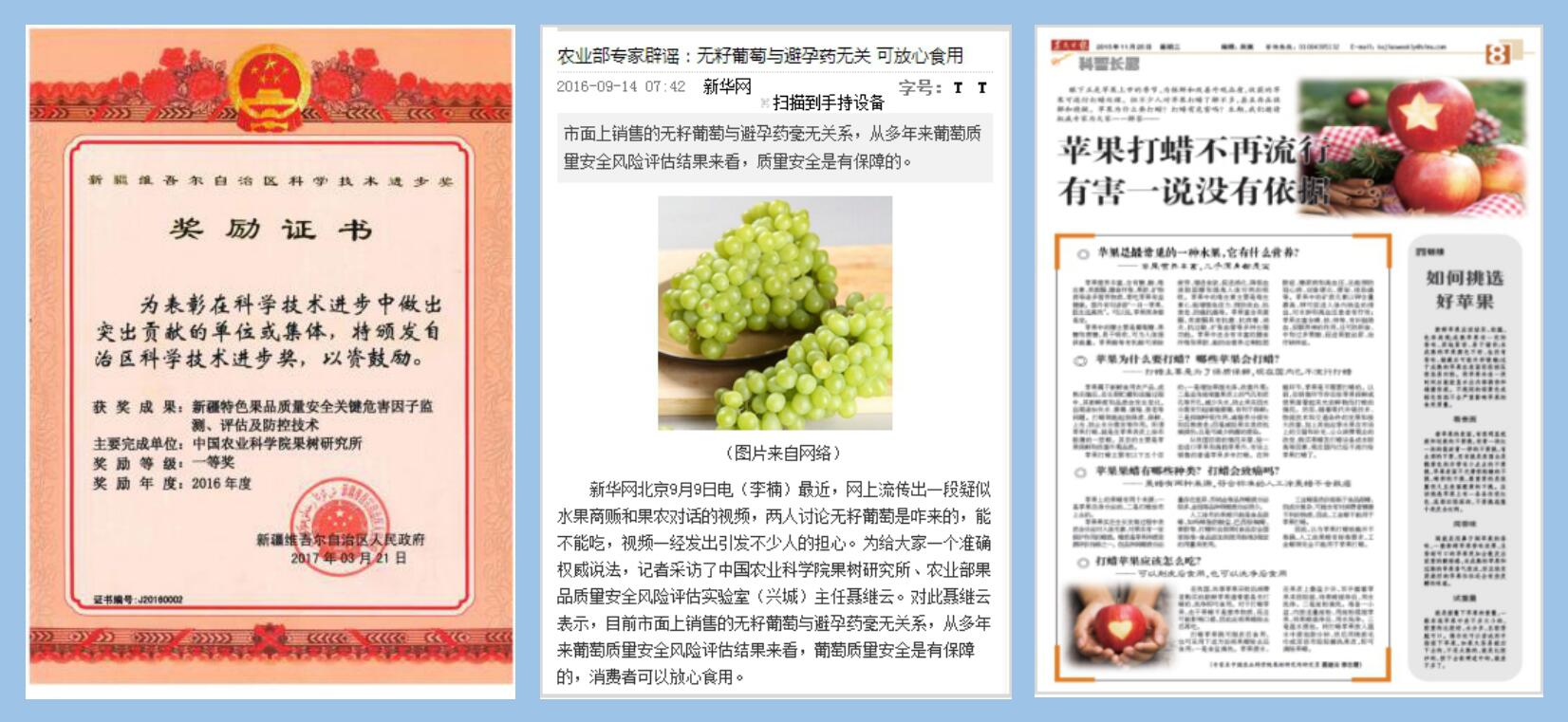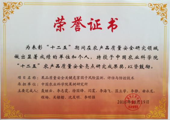 农业农村部果品质量安全风险评估实验室(兴城)始建于2013年,主要任务为支撑我国果业健康、稳定、可持续发展,保障果品安全生产和安全消费,有效开展果品产品质量安全风险评估、风险隐患动态跟踪评价和风险交流等工作,为政府果品质量安全风险管理提供科学依据。自平台建立以来,始终作为国家果品质量安全风险评估重大专项的牵头单位,完成了农业农村部果品质量安全风险评估任务,通过国家果品质量安全风险评估重大专项的实施,基本摸清了我国果品质量安全存在的主要风险因子;建立了果品中农药残留、重金属污染和硒风险评估技术,并用于果品质量安全风险评估;建立了基于色谱和色质联用技术的水果中杀螨剂、有机磷类、三唑类、植物生长调节剂和乙撑硫脲残留监测技术;针对苹果、梨、桃、葡萄、枣等大宗水果生产,研编了安全控制指南。至今,发表SCI/EI论文22篇、一级学报论文27篇、其他中文核心期刊论文68篇。主编著作12部,参编著作8部。主持制定国家/农业行业标准23项,参与制定农业行业标准16项。以第一或主要完成人取得中国农业科学院科学技术成果一等奖、新疆维吾尔自治区科技进步一等奖、全国商业科技进步一等奖、辽宁省科技成果三等奖等省部级科技成果奖5项,另有地市级科技成果奖8项。