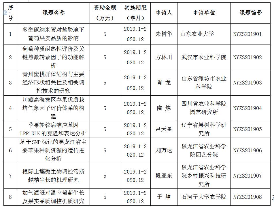 2019年12月3日,我所召开2019年农业农村部园艺作物种质资源利用重点实验室开放基金资助课题评审会议,经评审确定2019年部重点实验室开放基金拟资助课题共8项,每项资助5万元,具体课题名称如下: