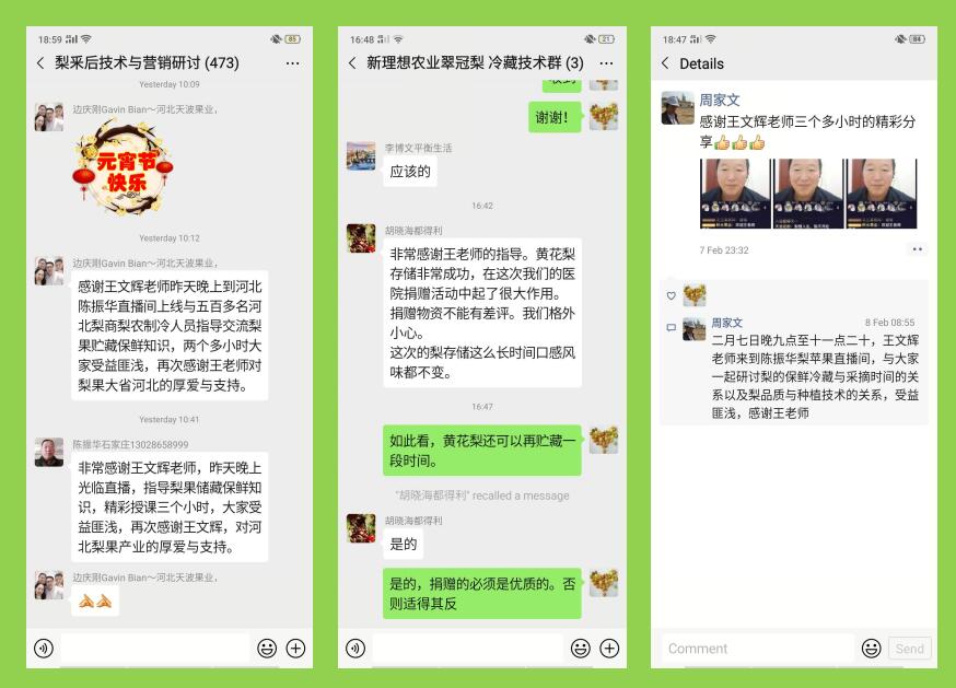 利用快手开展技术培训。疫情期间,利用快手等网络交流方式,2月7日20:40-23:20王文辉研究员应邀在河北梨农陈振华直播间针对梨果贮藏与物流保鲜、品质提升、品牌创建等相关技术知识进行网络授课,梨主产区河北和全国梨商、梨企、梨农、地方主管部门技术人员等500余人参加听课,研讨交流梨果贮藏保鲜技术,并就相关技术问题一一进行详细解答。群里也有湖北疫区的一些果农企业代表,特别针对湖北省砂梨新品种发展、采收及贮藏保鲜技术做了详细解答。