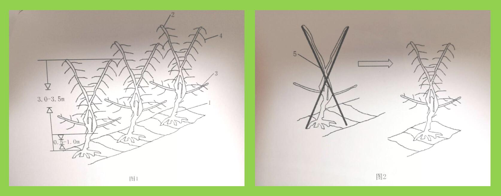 该树体与传统Y形的两主枝背向生长不同,主干上着生两个对向生长的主枝呈V两主枝对向生长,有效解决了盛果期主枝容易劈裂、主枝基部容易光秃的问题。每主枝上着生30个左右的结果枝,整株树着生70个左右的结果枝,结果枝与主枝夹角为90°左右,呈水平或略微下垂状态。(通讯员:何文上)