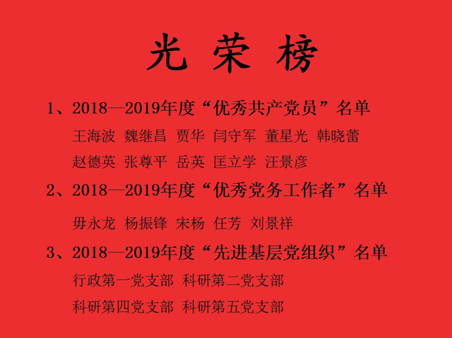 会上,程存刚副所长宣读了《关于表彰神彩v82018-2019年度优秀共产党员、优秀党务工作者和先进基层党组织的决定》,授予王海波等11位同志为神彩v82018-2019年度“优秀共产党员”;毋永龙等5位同志为神彩v82018-2019年度“优秀党务工作者”;行政第一党支部等4个党支部为神彩v82018-2019年度“先进基层党组织”。会议指出,广大党员干部要以受表彰的同志为榜样,勇于创新、锐意进取,为我所各项事业的发展而不懈努力。