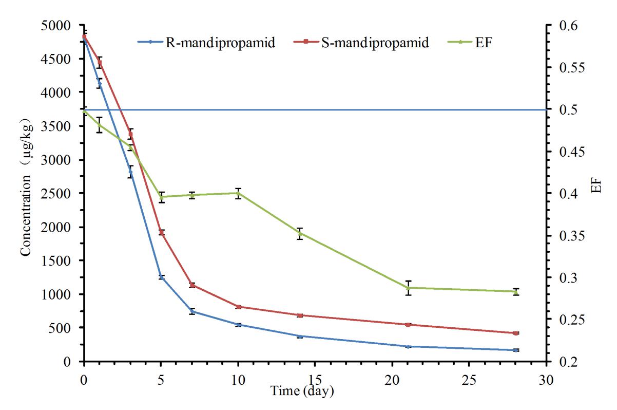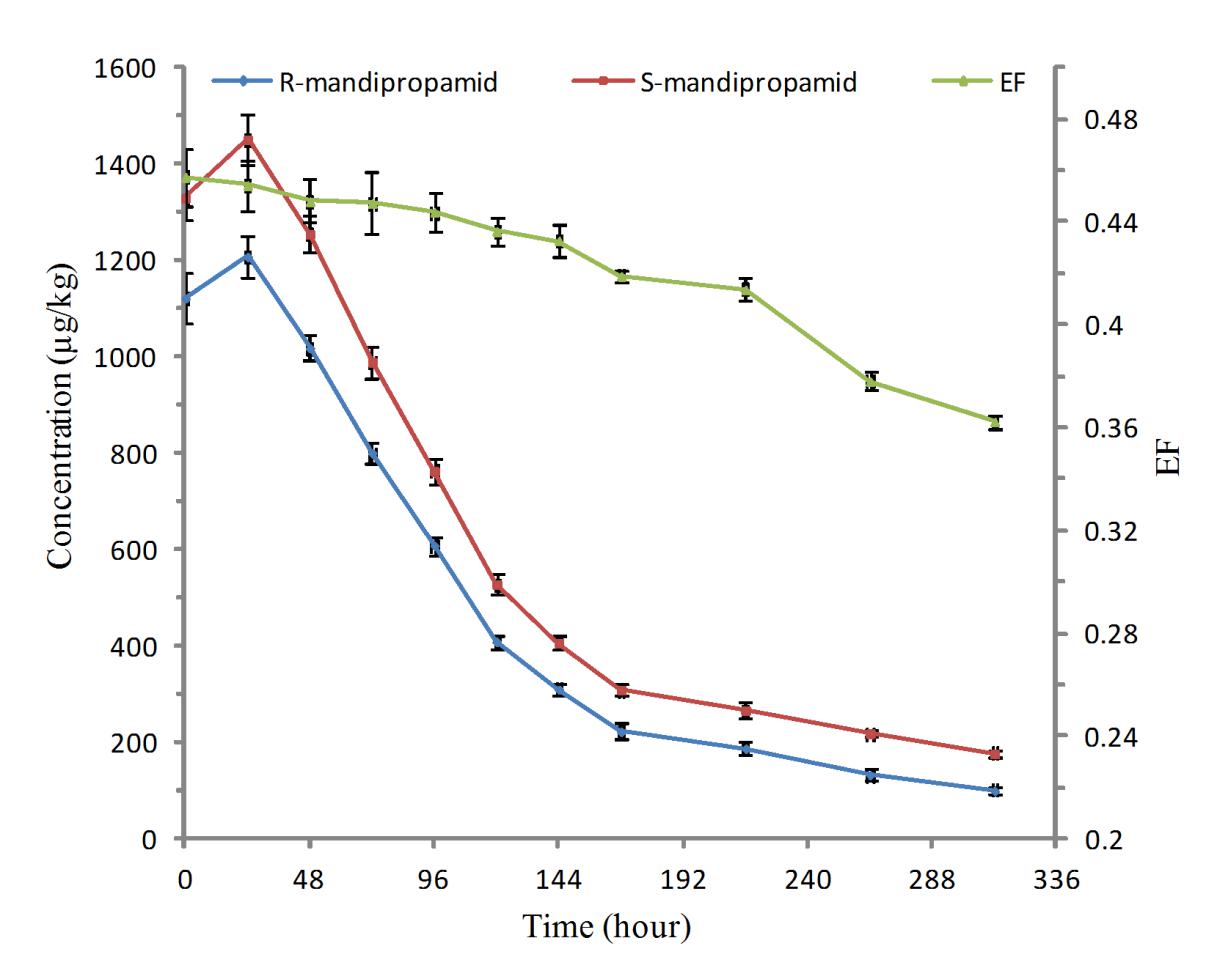 双炔酰菌胺为酰胺类杀菌剂其作用机理为抑制磷脂的生物合成,对绝大数由卵菌引起的叶部和果实病害均有很好的防效,可用于苹果斑点落叶病、葡萄霜霉病等病害的防治。然而,双炔酰菌胺具有手性结构,生产和销售过程中以外消旋体形式存在,在植物体内和微生物存在的条件下存在立体选择性降解。该研究首次开展了双炔酰菌胺对映体在葡萄体内和葡萄酒加工过程中的立体选择性环境行为研究,结果表明,双炔酰菌胺不同对映体在葡萄体内及葡萄酿酒过程中均存在显著的立体选择性降解行为,该研究为双炔酰菌胺的安全使用和风险评估提供了有效的技术支撑。