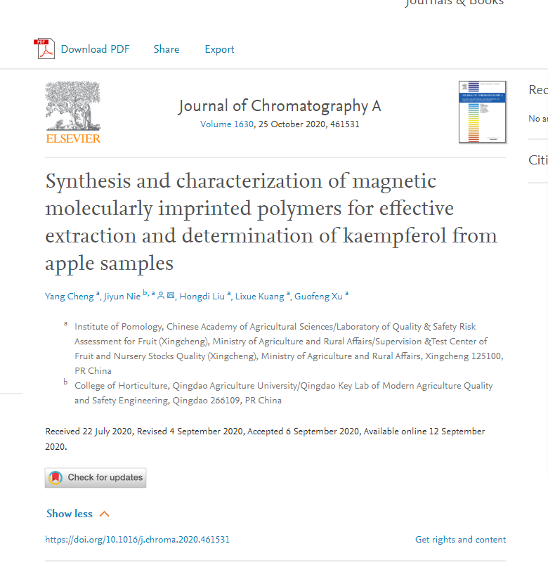 近日,神彩v8果品质量安全风险监测与评估创新团队在分析化学领域重要期刊Journal of Chromatography A》在线发表了题为Synthesis and characterization of magnetic molecularly imprinted polymers for effective extraction and determination of kaempferol from apple samples的研究论文(第一作者程杨博士,通讯作者聂继云研究员)。