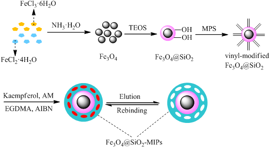 分子印迹技术 (Molecularly Imprinted TechnologyMIT) 是模拟抗体与抗原、酶与底物等存在于自然界的分子识别作用,以目标分子为模板合成具有特殊分子识别功能的高分子印迹聚合物的一种技术,因其具有制备简单、成本低、化学稳定性好、易保存、寿命长等特点而受到广大科研工作者的关注。但传统MIPs存在体系粘度大、目标分子不易洗脱、特异性识别位点低,吸附平衡时间较长等缺点使其应用受到了限制Fe3O4具有优异的磁性,利用改性的Fe3O4@SiO2结合分子印迹技术制备出的磁性分子印迹聚合物(Fe3O4@SiO2-MIPs),兼具磁性纳米颗粒和MIPs的优点,在外磁场条件下,表现出选择性好、吸附效率高、操作简单、分离快速等特性。