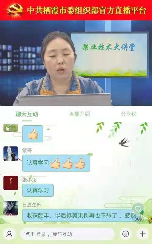 25日下午,赵德英通过栖霞市果都党建“果业技术大讲堂”直播平台,开展了“苹果园整形修剪存在问题和配套解决方案”线上培训,针对栖霞苹果园整形修剪过程中存在的突出问题,重点围绕新果园如何建模式,老果园如何提品质进行了专题讲解。吸引了近万名果农在线“听课”,纷纷留言评论并点赞。