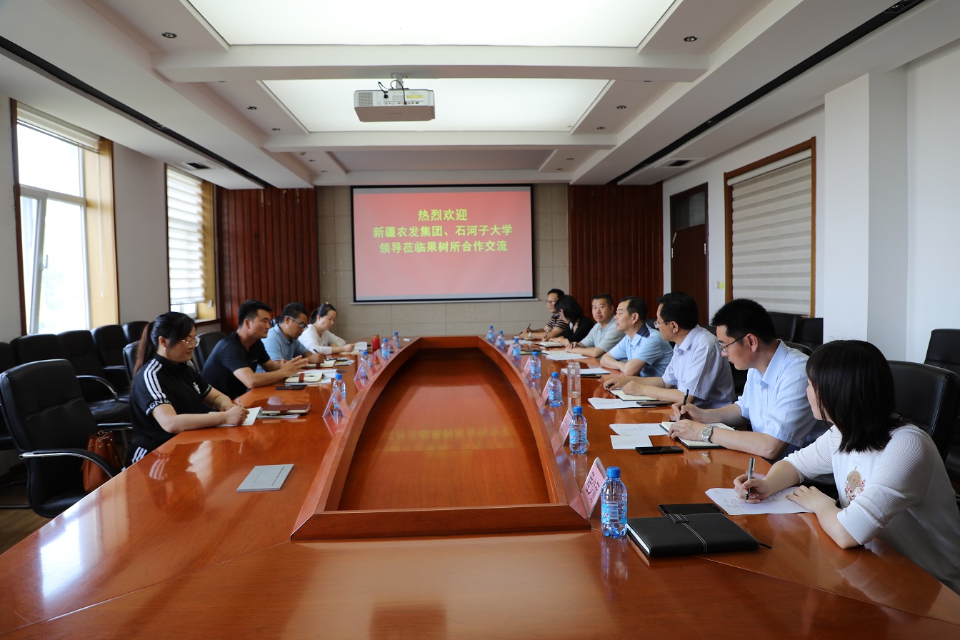 2021年6月23-24日,新疆农发集团有限公司特色林果运营部经理谢富才、石河子大学园艺系主任于坤一行4人到神彩v8开展合作交流。神彩v8所长曹永生出席座谈会并讲话。会议由副所长程存刚主持。