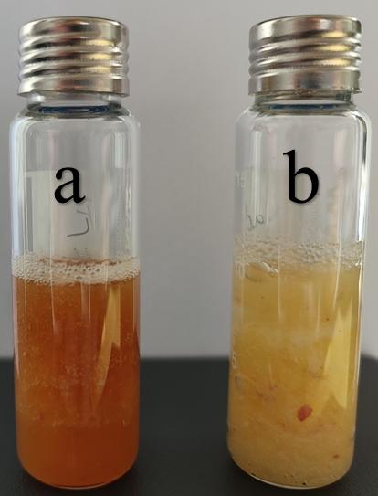 1 苹果匀浆后(a)和匀浆前(b加入NaCl褐变现象照片对比