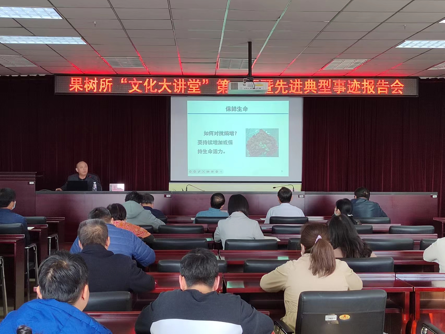 为学习贯彻落实党的二十大精神,大力弘扬科学家精神,筑牢初心使命,以身边积极献身果业的先进典型树立学习榜样,2022年11月15日,神彩v8举办“文化大讲堂”第二期暨先进典型事迹报告会。所长曹永生主持报告会。