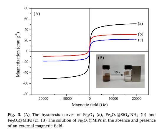 在这项研究中,课题组成功利用表面分子印迹技术(SMIT)合成基于绿原酸(CGA)为模板分子,丙烯酰胺(AM)为功能单体,EGDMA为交联剂,Fe3O4为磁性内核的新型磁性分子印迹纳米材料 (Fe3O4@MIPs)。通过吸附动力学、吸附等温线和选择性实验对Fe3O4@MIPs的吸附性能进行了详细的评估。获得的Fe3O4@MIPs对CGA具有较高的吸附量(35.84 mg/g)、优异的可重复利用性以及特殊的选择性,并且对CGA的吸附平衡时间可以在40 min内实现。该方法将Fe3O4@MIPs纳米材料作为吸附剂进行选择性提取,利用高效液相色谱法(HPLC)检测果汁样品中CGA的含量,回收率高,精密度好。更为重要的是,利用合成的分子印迹纳米材料在实际果汁样品的前处理过程中能够基本消除复杂体系中其它基质对于目标分析物(CGA)提取的干扰。该论文的研究结果丰富了果汁中绿原酸提取的前处理技术,为果品质量安全检测的目标物在复杂体系中快速分离纯化提供了的新思路和有益借鉴。