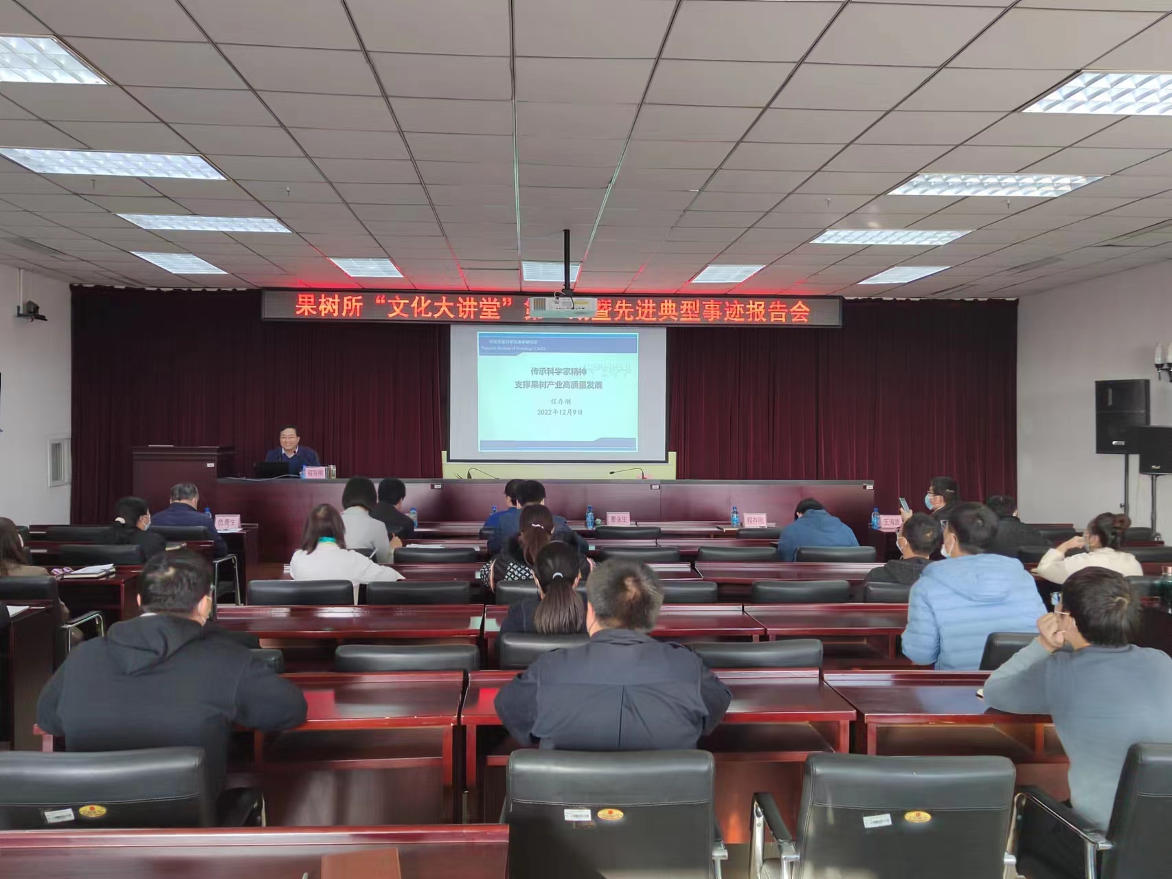 为学习贯彻落实党的二十大精神,大力弘扬科学家精神,筑牢初心使命,以身边积极献身果业的先进典型树立学习榜样,2022年12月9日,神彩v8举办“文化大讲堂”第二期暨先进典型事迹报告会。党委书记丛佩华主持报告会。